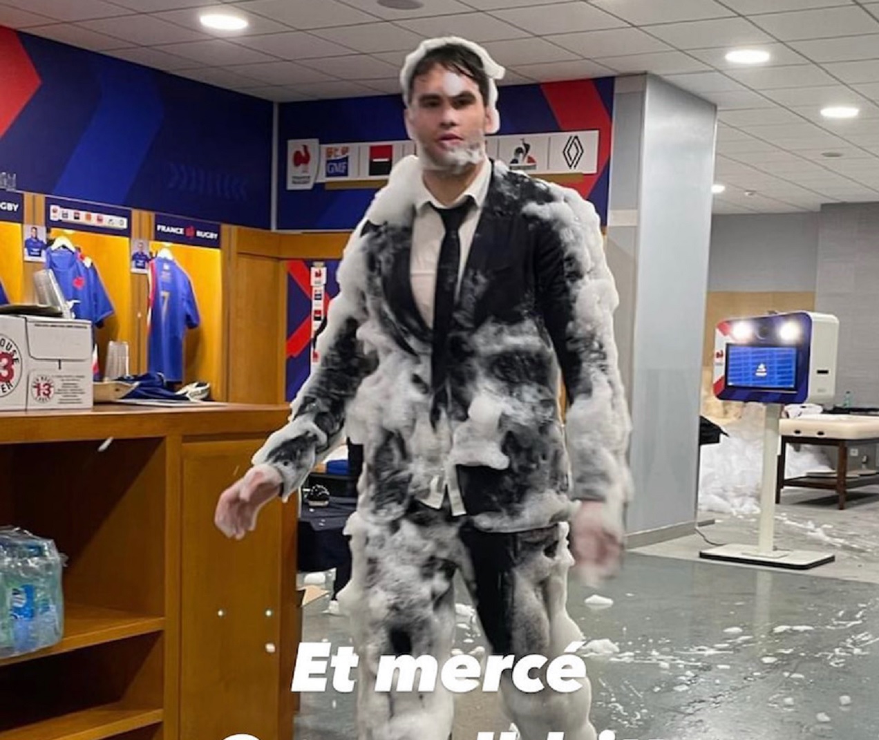 A l’issue de la victoire contre l’Angleterre, l’ailier du XV de France, Damian Penaud a terminé dans la piscine du
